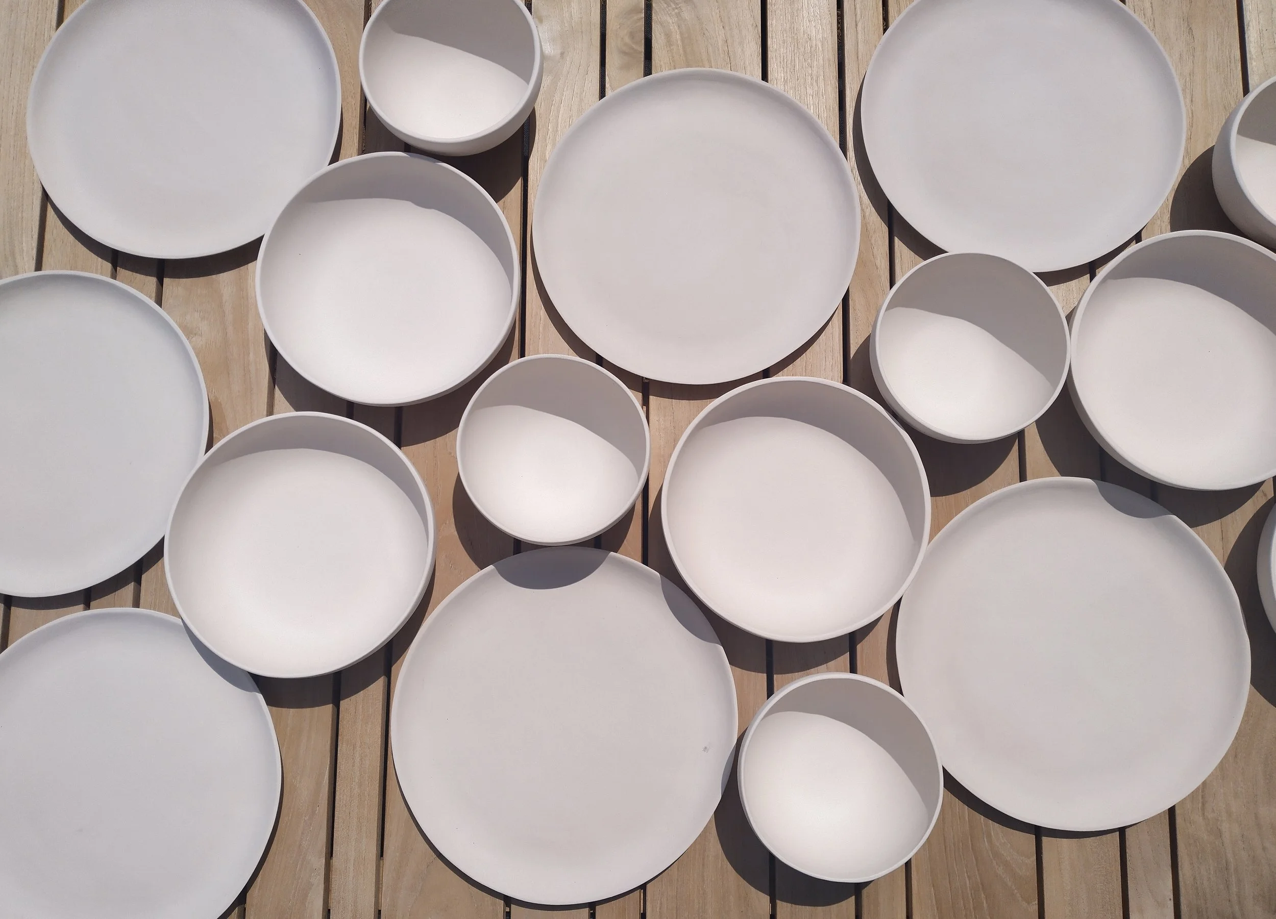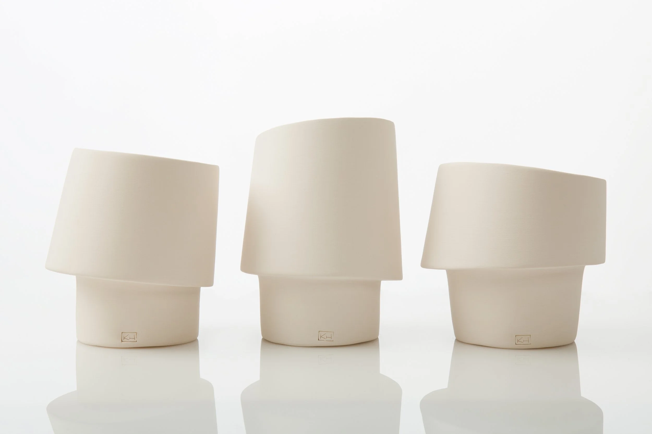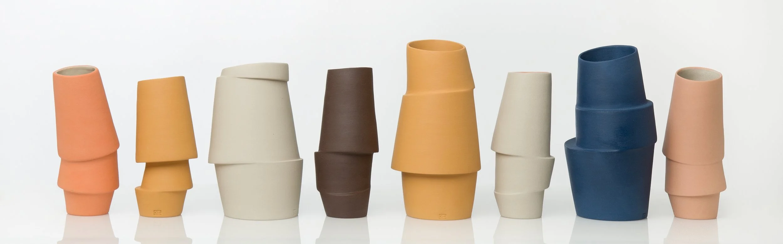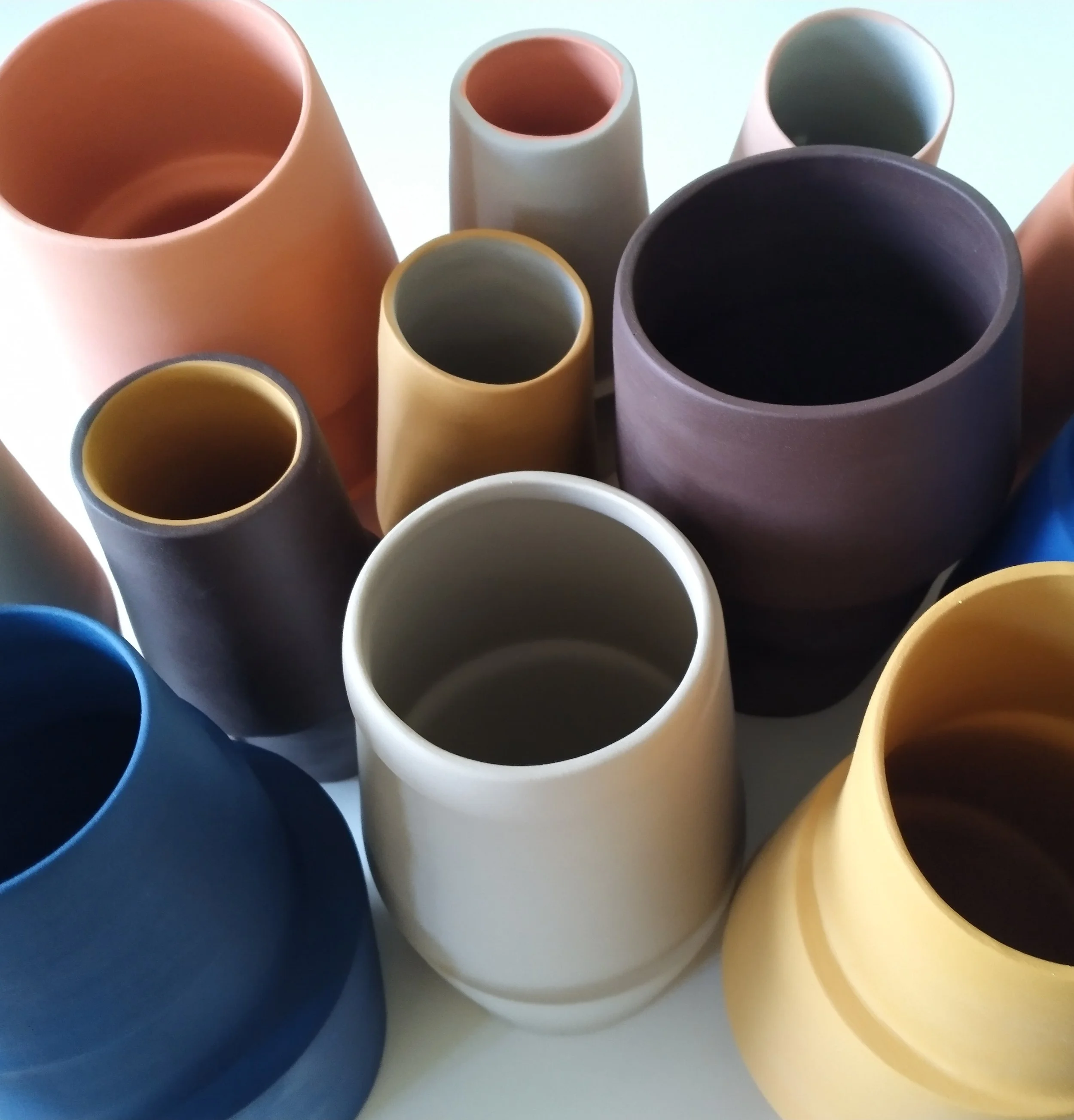 Al snel werd duidelijk dat mijn interesse ging naar het gebruik van gietklei en dat is voor mij een doordacht technisch proces. Het schetsen vooraf, het maken en stapelen van gipsmallen, het inkleuren en gieten van de klei, de droog- en bakprocessen. Het resultaat is telkens weer verrassend anders. Elk stuk in zijn unieke vorm, speels en eindeloos te combineren, abstract en puur.